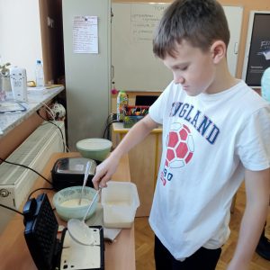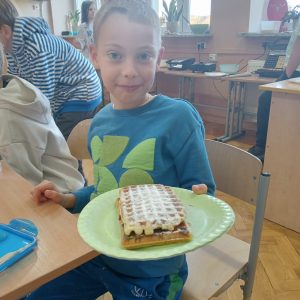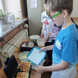 W miniony piątek, z inicjatywy samorządu klasowego, uczniowie samodzielnie przygotowali pyszne drugie śniadanie. Zaopatrzeni w potrzebne produkty oraz w gofrownice z zapałem przystąpili najpierw do pieczenia, a następnie dekorowania ulubionymi dodatkami chrupiących gofrów. Wykonywanie tych czynności przyniosło dzieciom dużo radości oraz satysfakcji. Pracy towarzyszył śmiech i wesołe rozmowy, ale przede wszystkim skupienie i przestrzeganie zasad bezpieczeństwa podczas korzystania z rozgrzanych gofrownic.