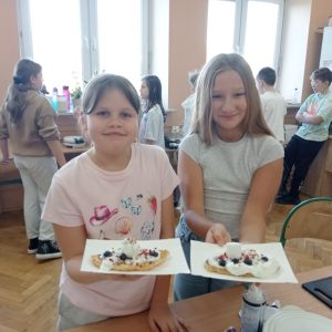Efektem takiej lekcji są nie tylko smaczne przekąski, po których już dawno nie ma śladu. Wartość dodana tego mile spędzonego czasu to umiejętność współpracy, dzielenia się, cierpliwego czekania na swoją kolej. To także współodpowiedzialność za porządek w miejscu pracy, co jak się okazało, wszyscy doskonale rozumieją. Bowiem tak samo szybko, jak znikały gofry, tak samo sprawnie czwartoklasiści uporali się z brudnymi talerzami, zużytymi serwetkami, czy zachlapanymi ciastem ławkami.