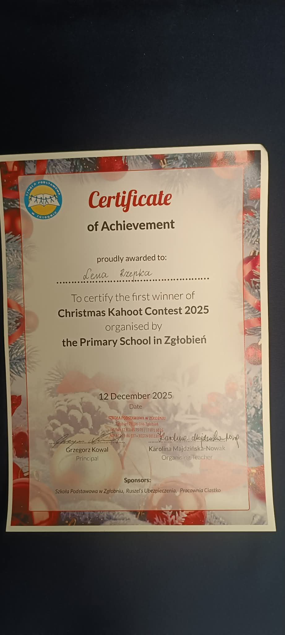 Lena Rzepka wygrała pierwszą edycję gminnego Konkursu Świątecznego „Christmas Kahoot Contest”. Konkurs miał na celu sprawdzenie wiedzy uczniów z siódmej klasy z tematu Świąt Bożego Narodzenia oraz wprowadzić przyjemną przedświąteczną atmosferę. Telefon, który zwykle młodym ludziom służy do scrollowania i przeglądania aplikacji internetowych, tym razem okazał się urządzeniem przyjaznym uczeniu się i zdobywaniu wiedzy, gdyż cały konkurs odbywał się właśnie na telefonach i platformie kahoot.