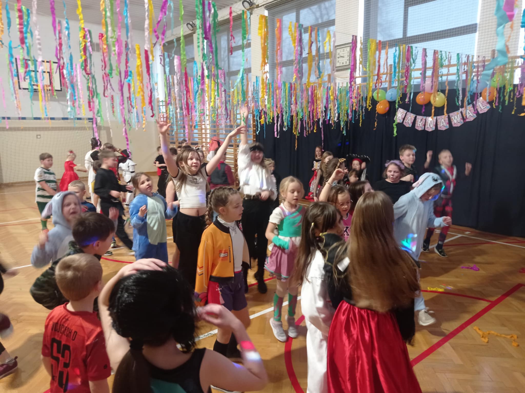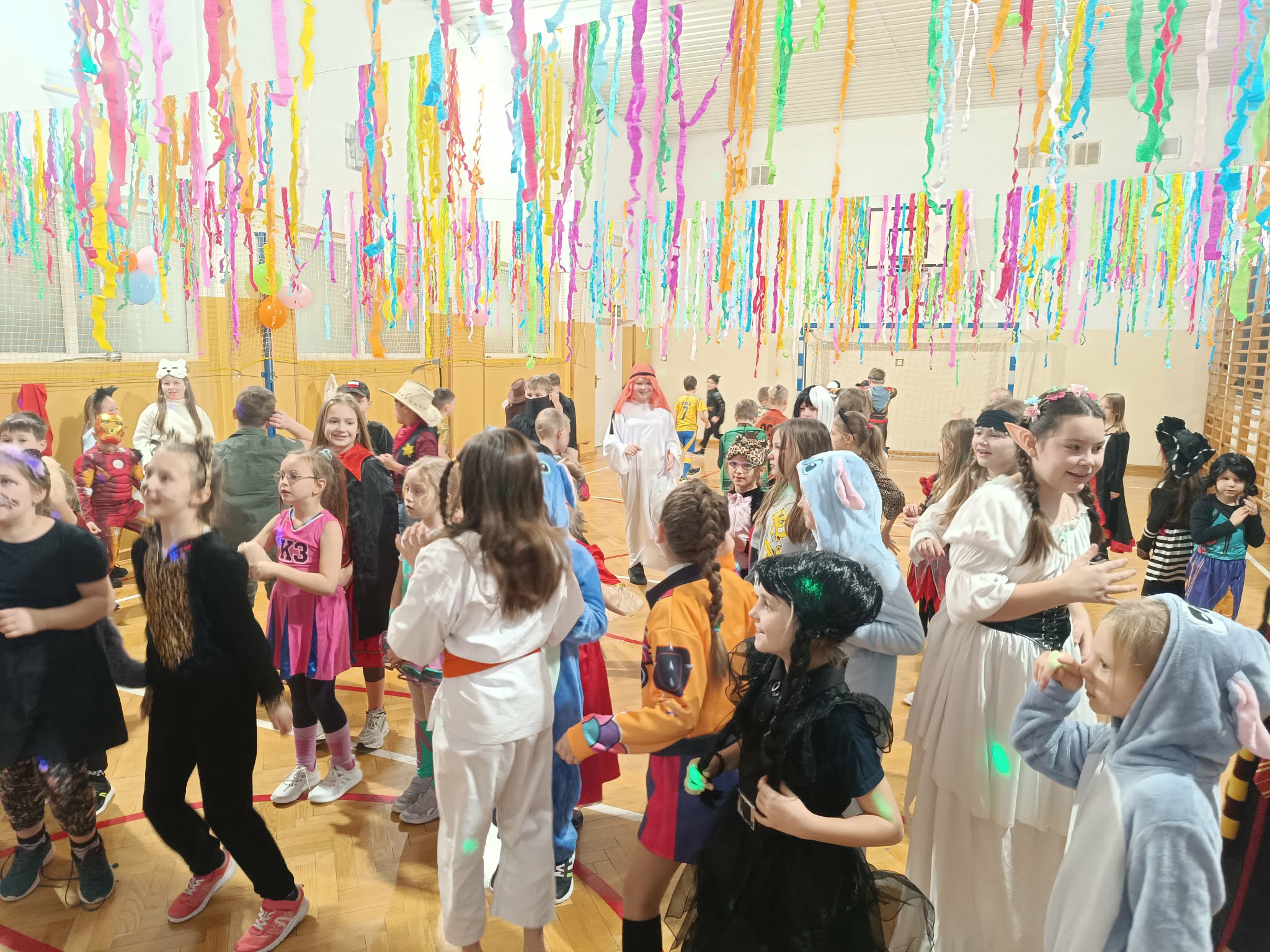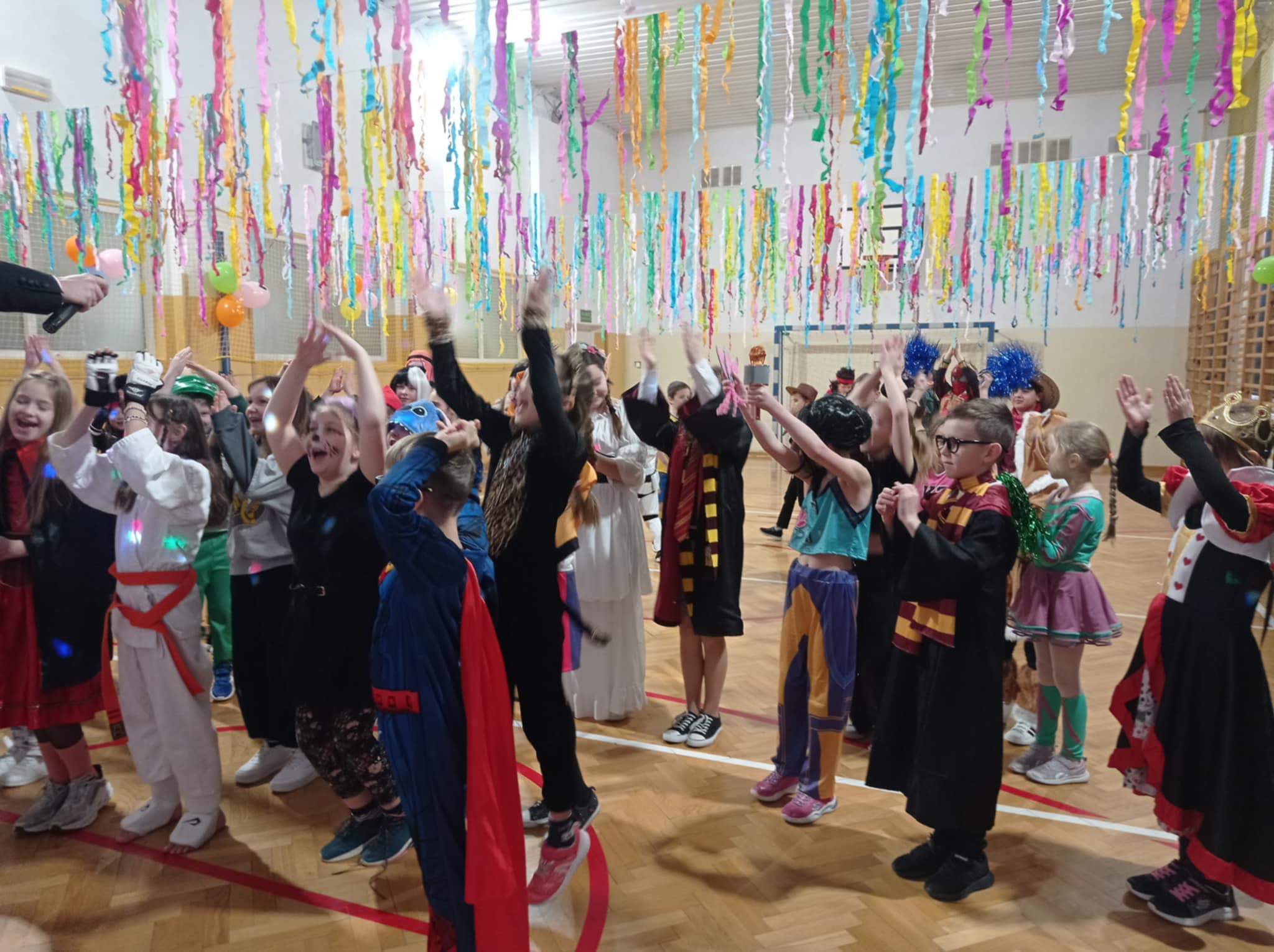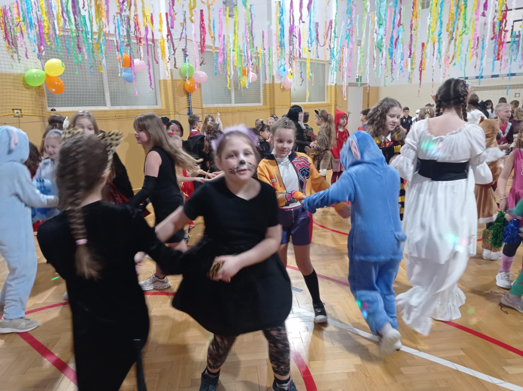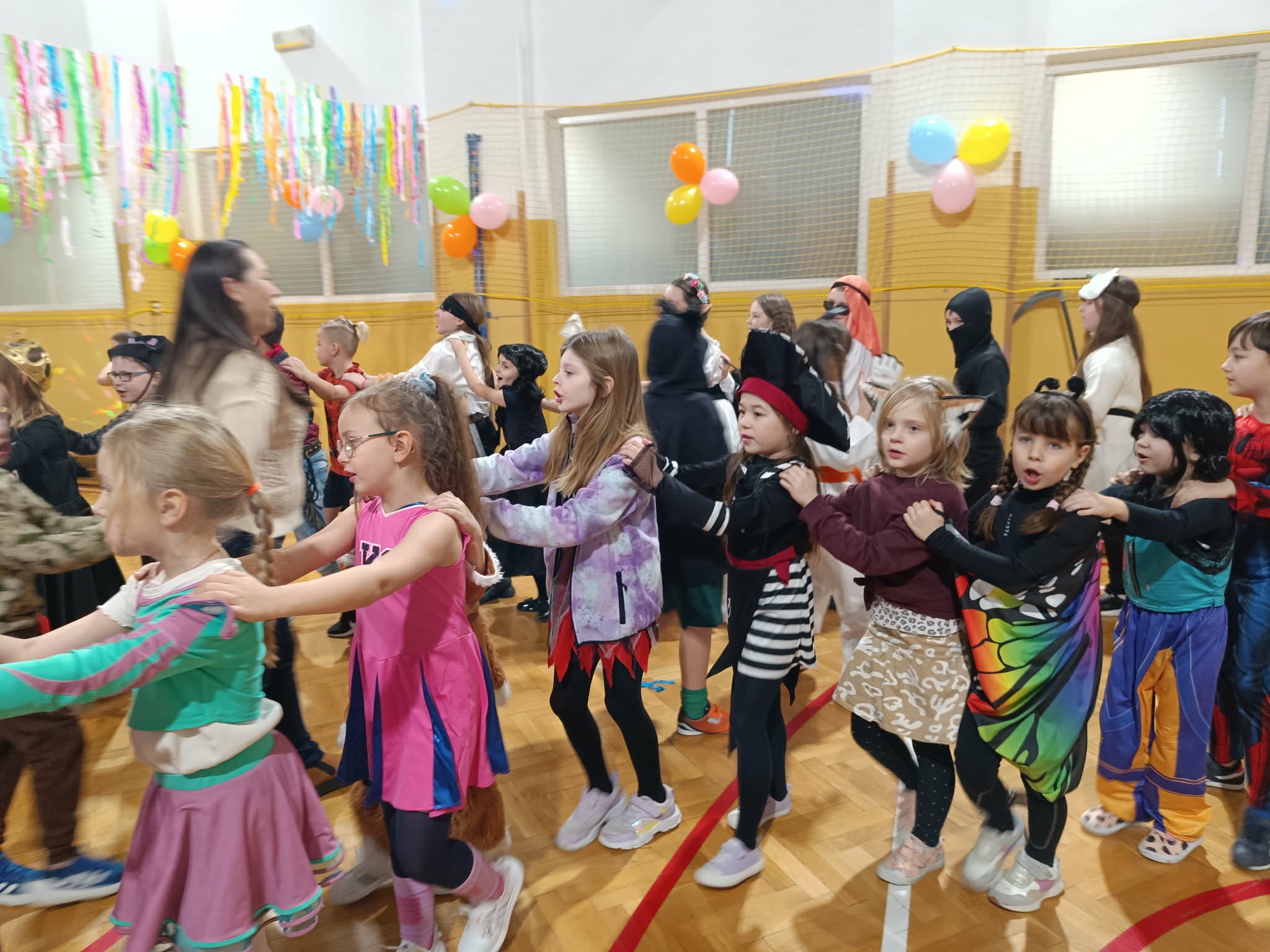 We wtorek, 13 stycznia w naszej szkole odbył się długo oczekiwany bal karnawałowy. Przystrojona sala gimnastyczna zamieniła się w prawdziwą salę balowa, a uczniowie wcielili się w nowe role. Na parkiecie pojawili się bohaterowie znanych bajek i filmów tj. Czerwony Kapturek, Harry Poter, Hermiona, Wednesday, księżniczki, piraci, wróżki, ale również stróże prawa, superbohaterowie i słodkie zwierzaki.  Karnawałowe kreacje zaskakiwały, budził podziw, a nawet przerażenie. Jak przystało na prawdziwy bal, nie zabrakło pląsów i zabaw tanecznych. Były pociągi, korowody, kółeczka i tańce w parach. Dzieci chętnie brały  udział w  konkursach, a zwycięzcy nagradzani byli gromkimi brawami. Ten radosny dzień wszyscy zachowają w pamięci, co najmniej do przyszłego karnawału.