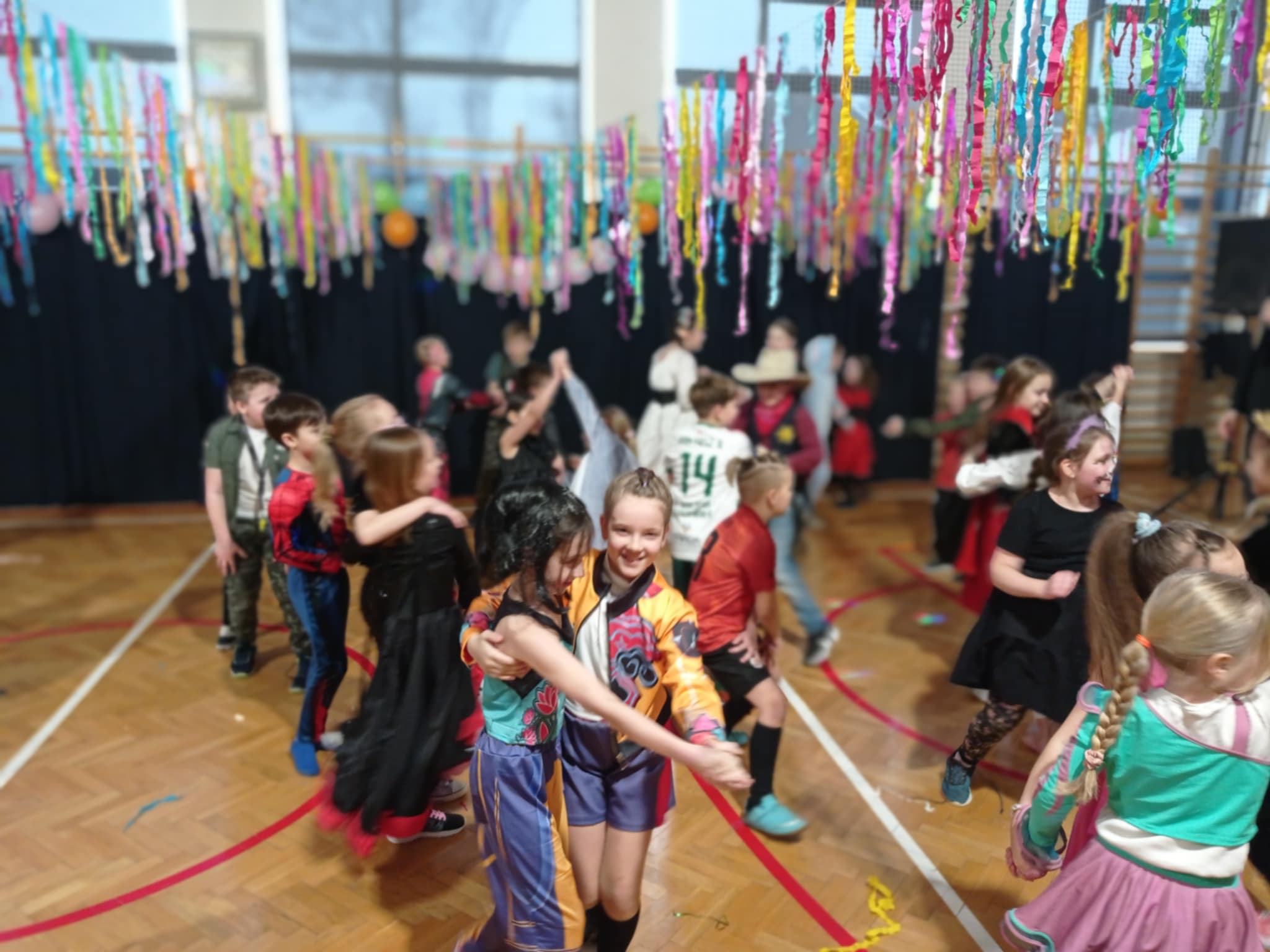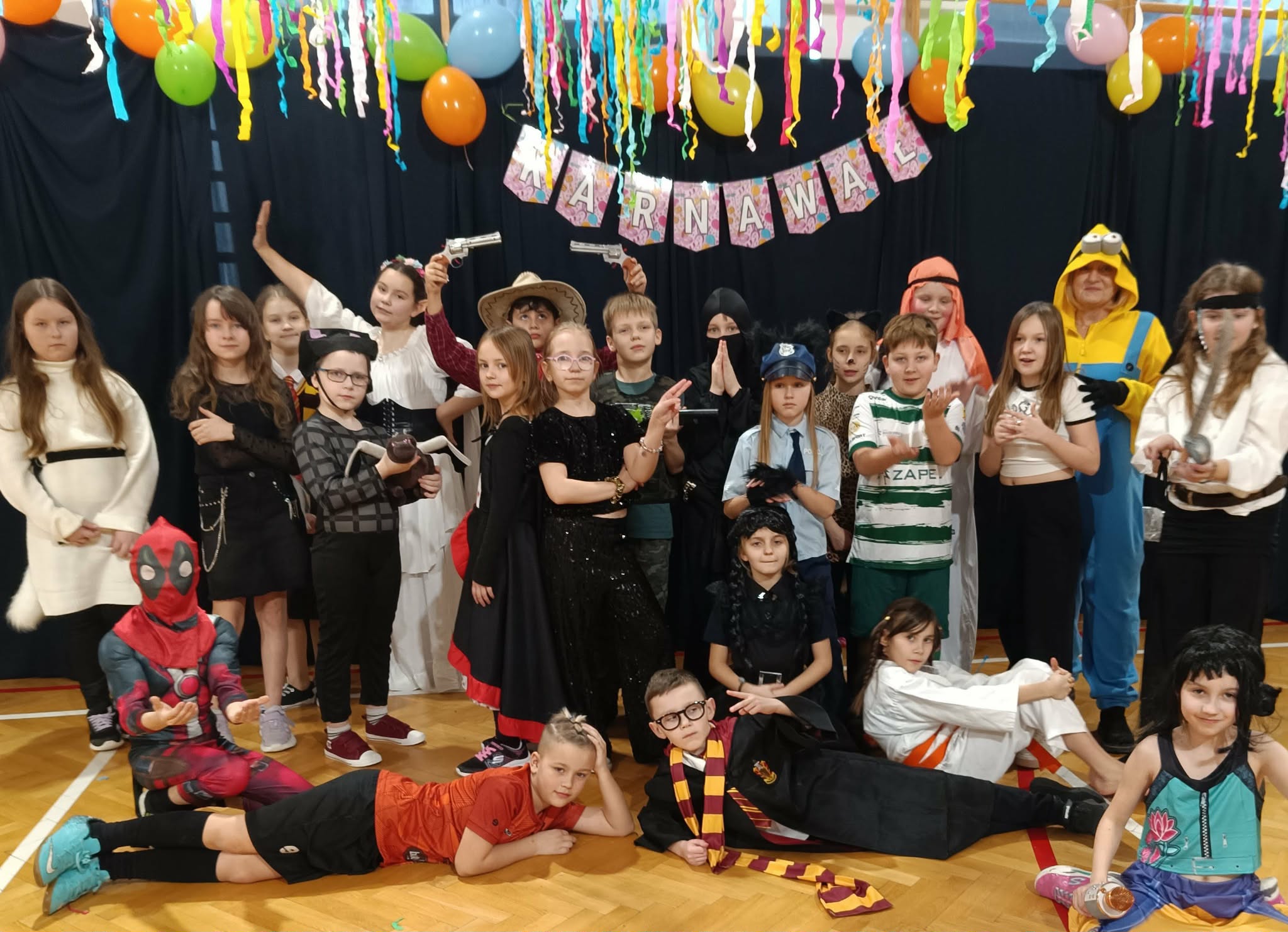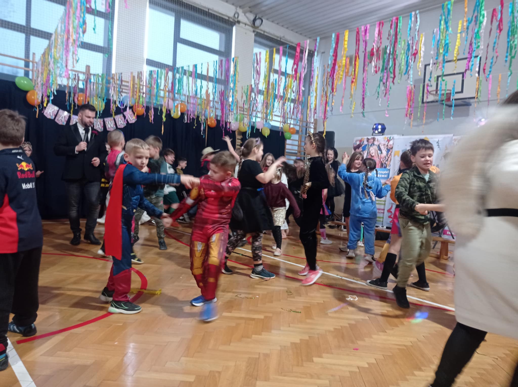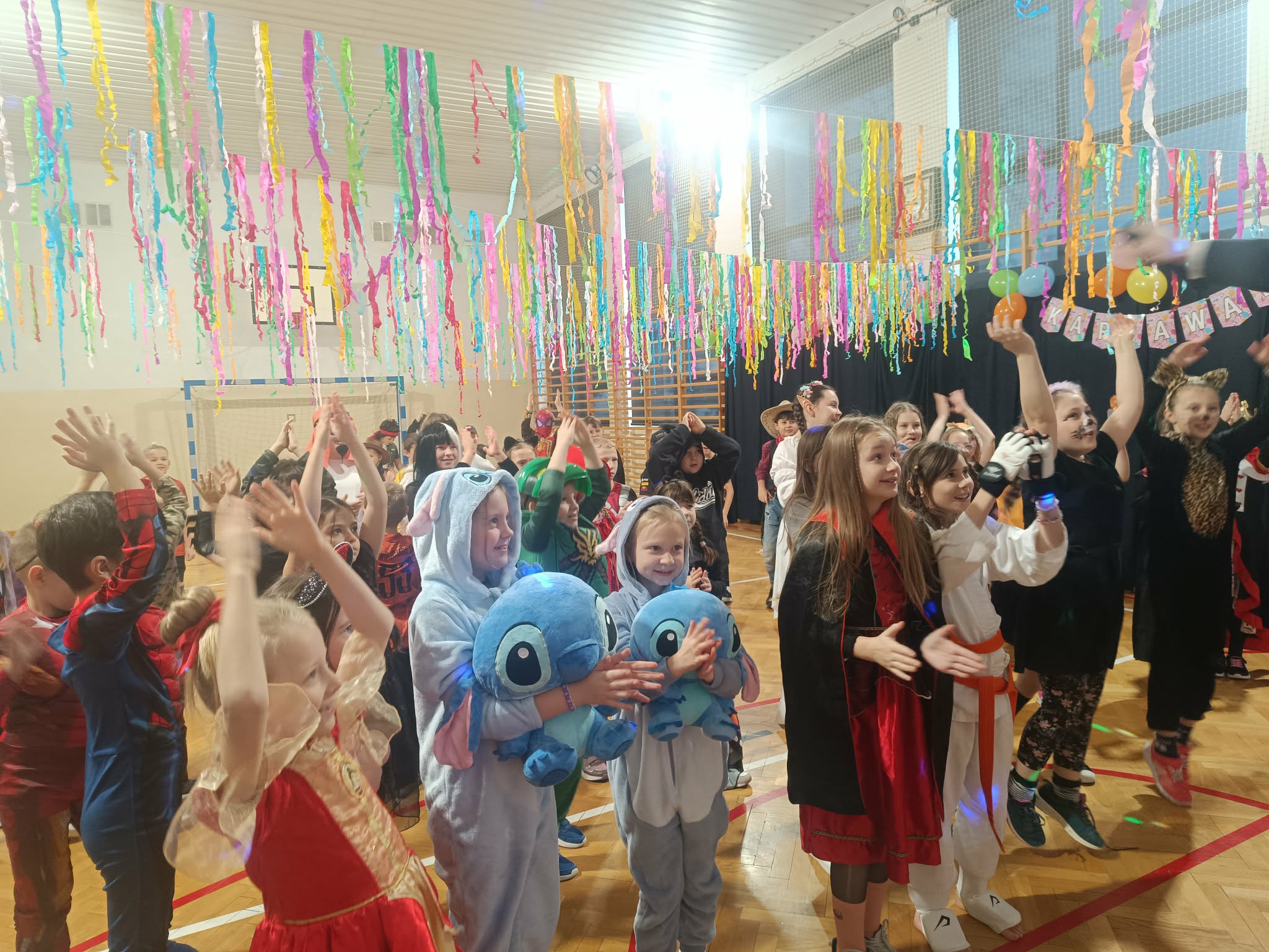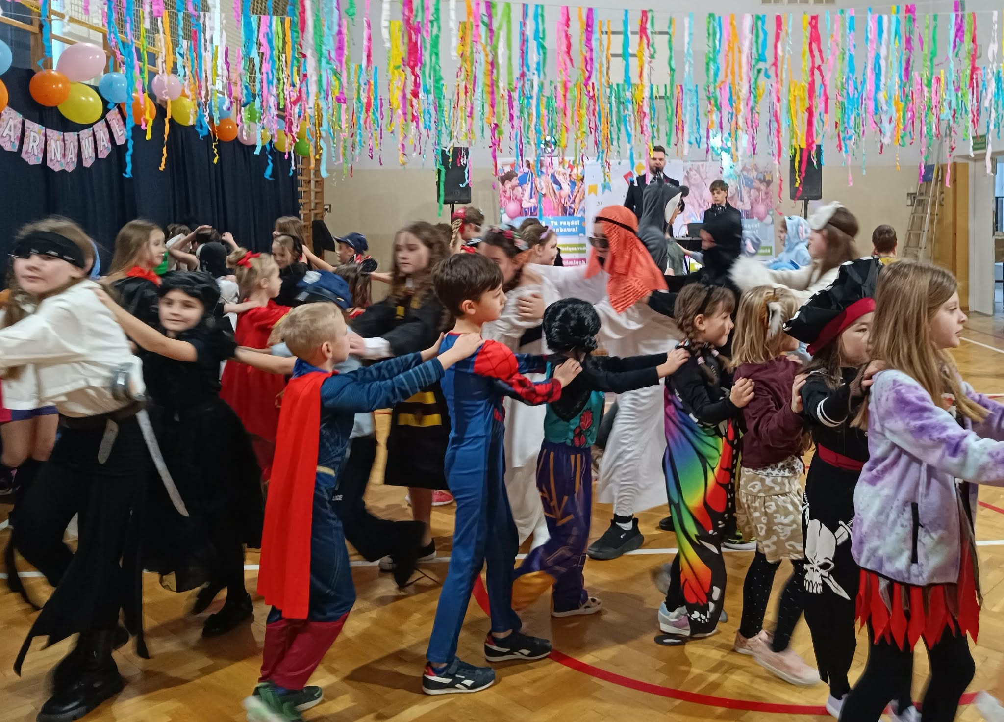 We wtorek, 13 stycznia w naszej szkole odbył się długo oczekiwany bal karnawałowy. Przystrojona sala gimnastyczna zamieniła się w prawdziwą salę balowa, a uczniowie wcielili się w nowe role. Na parkiecie pojawili się bohaterowie znanych bajek i filmów tj. Czerwony Kapturek, Harry Poter, Hermiona, Wednesday, księżniczki, piraci, wróżki, ale również stróże prawa, superbohaterowie i słodkie zwierzaki.  Karnawałowe kreacje zaskakiwały, budził podziw, a nawet przerażenie. Jak przystało na prawdziwy bal, nie zabrakło pląsów i zabaw tanecznych. Były pociągi, korowody, kółeczka i tańce w parach. Dzieci chętnie brały  udział w  konkursach, a zwycięzcy nagradzani byli gromkimi brawami. Ten radosny dzień wszyscy zachowają w pamięci, co najmniej do przyszłego karnawału.