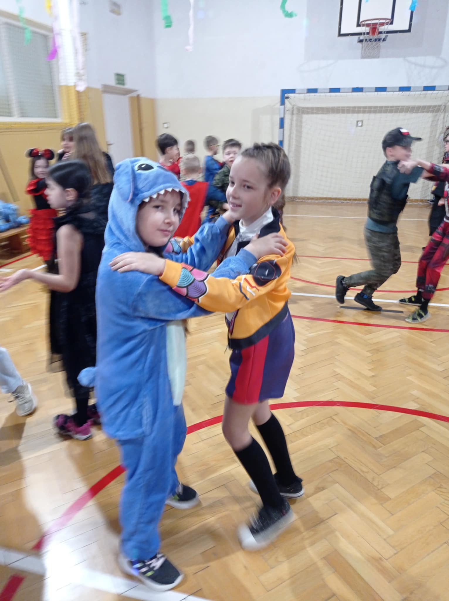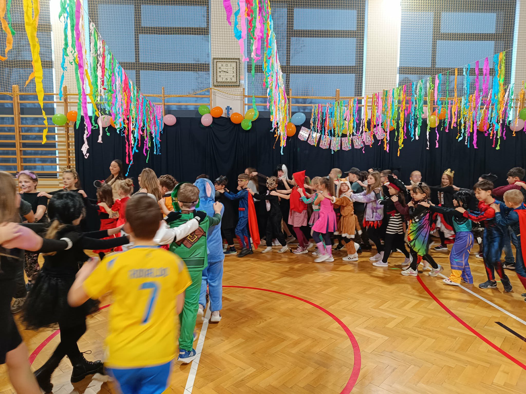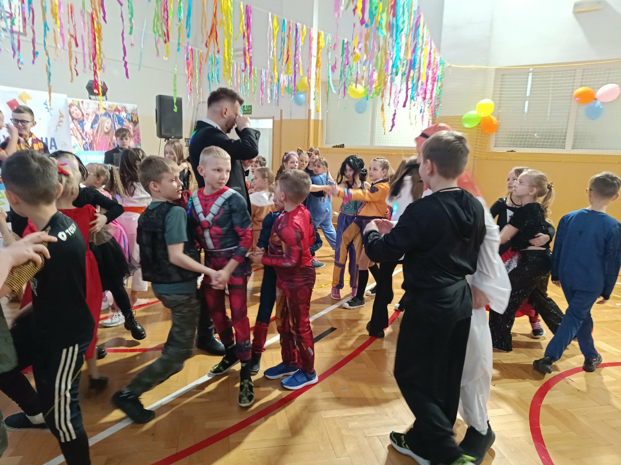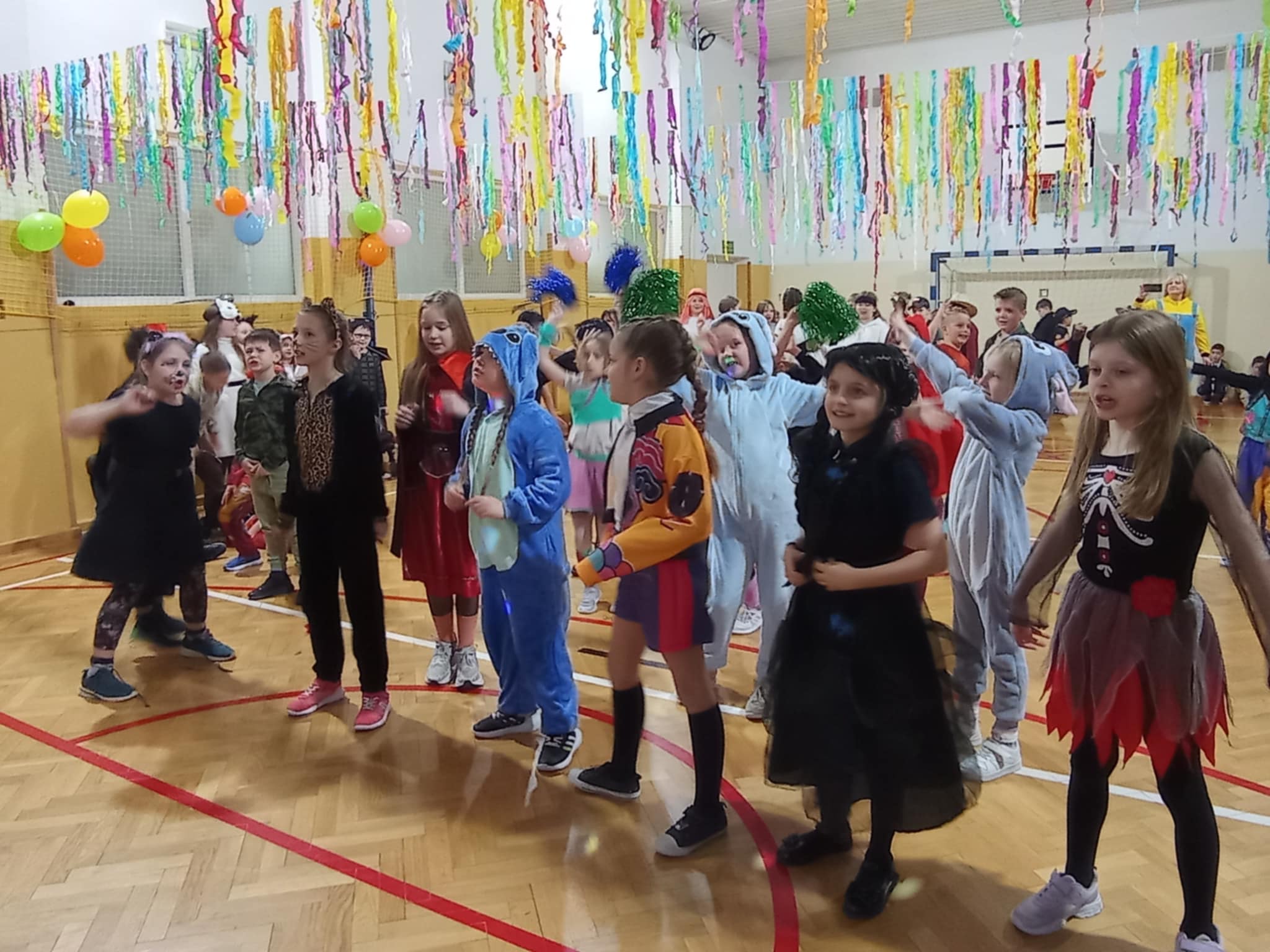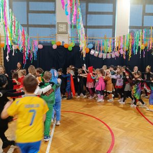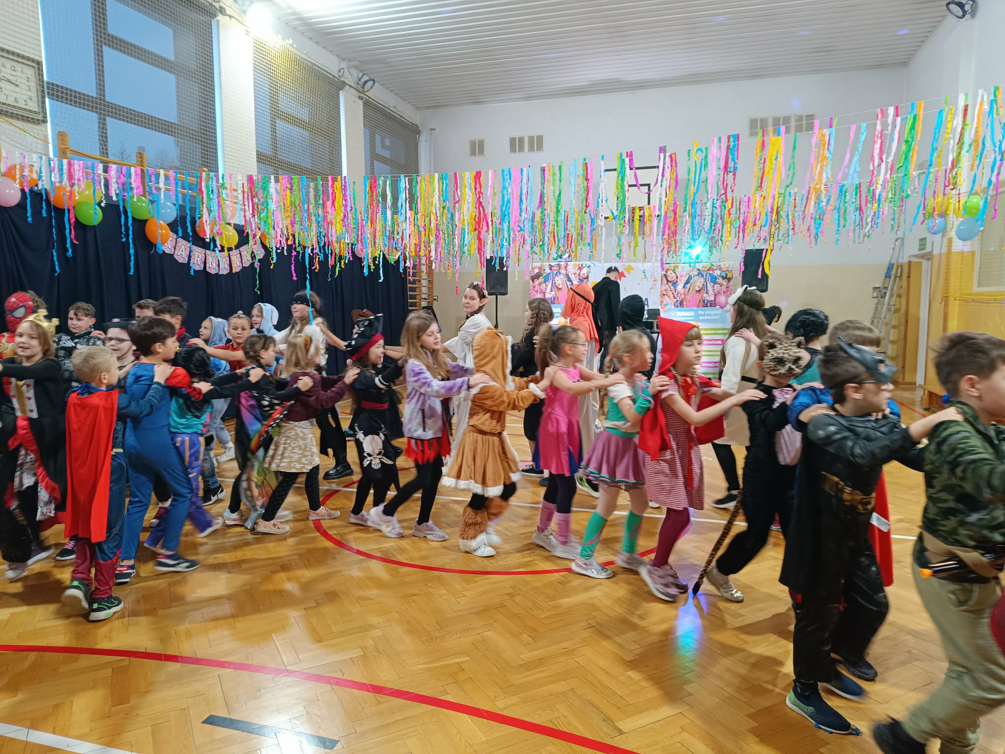 We wtorek, 13 stycznia w naszej szkole odbył się długo oczekiwany bal karnawałowy. Przystrojona sala gimnastyczna zamieniła się w prawdziwą salę balowa, a uczniowie wcielili się w nowe role. Na parkiecie pojawili się bohaterowie znanych bajek i filmów tj. Czerwony Kapturek, Harry Poter, Hermiona, Wednesday, księżniczki, piraci, wróżki, ale również stróże prawa, superbohaterowie i słodkie zwierzaki.  Karnawałowe kreacje zaskakiwały, budził podziw, a nawet przerażenie. Jak przystało na prawdziwy bal, nie zabrakło pląsów i zabaw tanecznych. Były pociągi, korowody, kółeczka i tańce w parach. Dzieci chętnie brały  udział w  konkursach, a zwycięzcy nagradzani byli gromkimi brawami. Ten radosny dzień wszyscy zachowają w pamięci, co najmniej do przyszłego karnawału.
