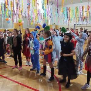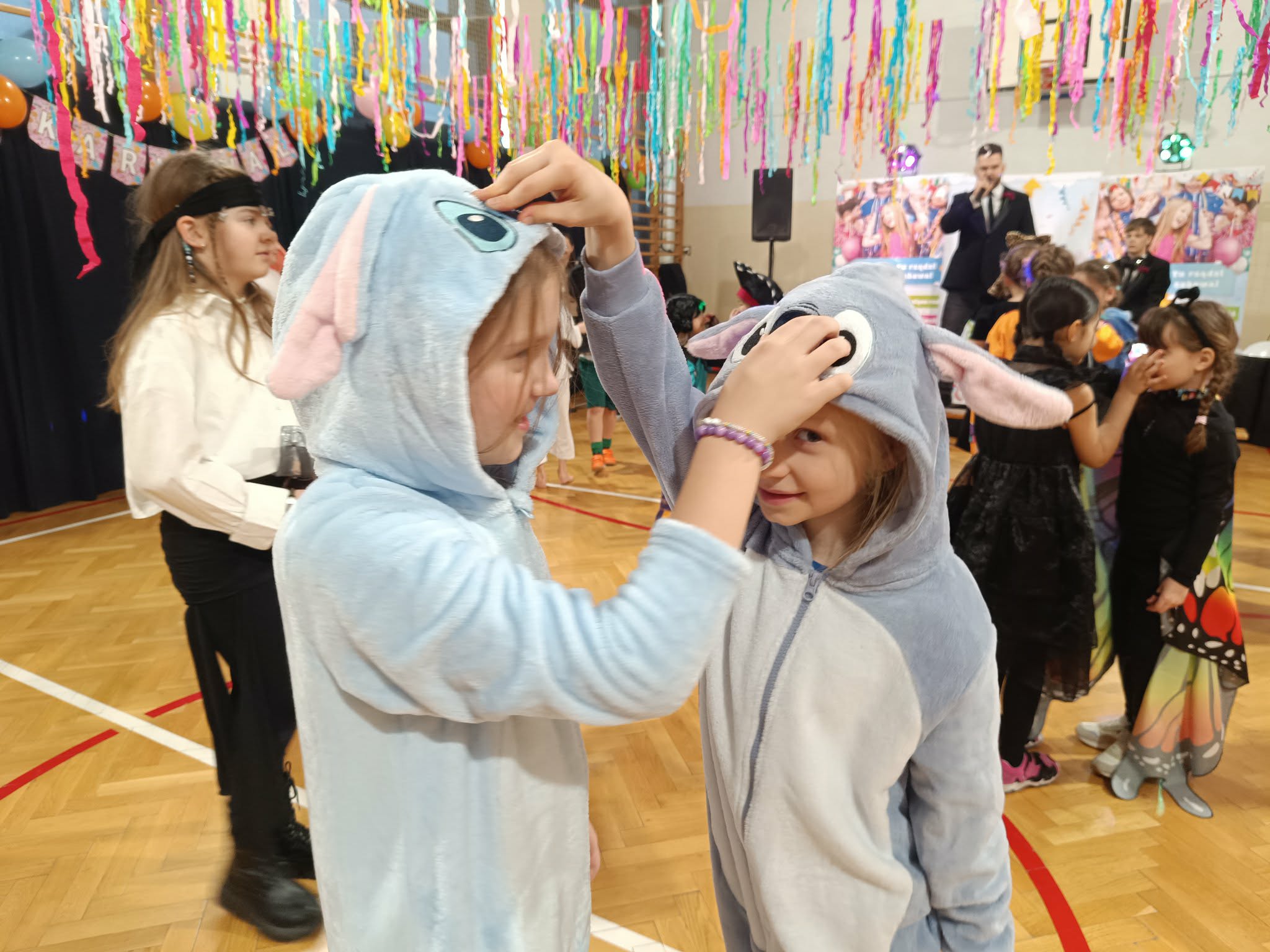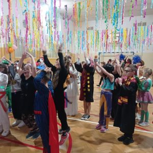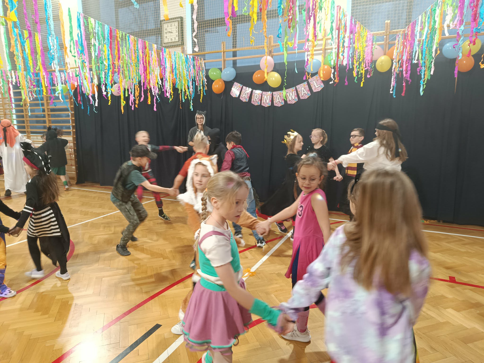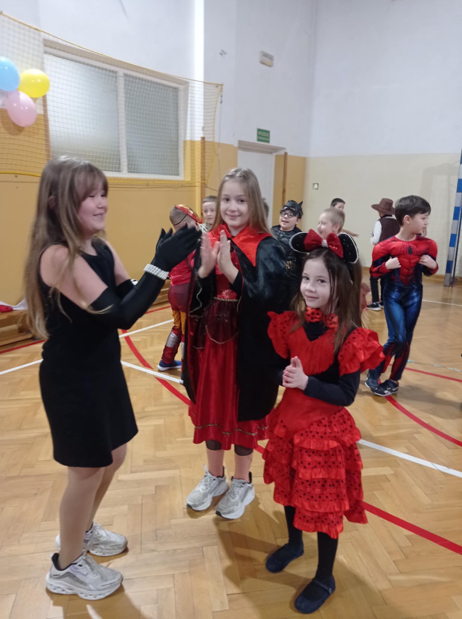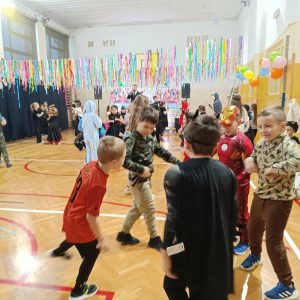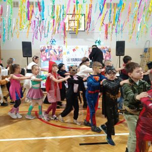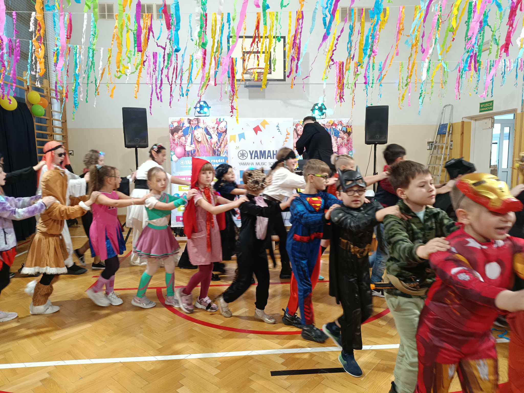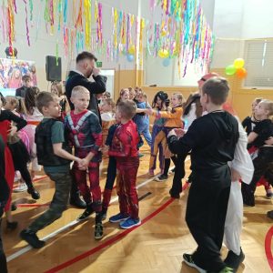 We wtorek, 13 stycznia w naszej szkole odbył się długo oczekiwany bal karnawałowy. Przystrojona sala gimnastyczna zamieniła się w prawdziwą salę balowa, a uczniowie wcielili się w nowe role. Na parkiecie pojawili się bohaterowie znanych bajek i filmów tj. Czerwony Kapturek, Harry Poter, Hermiona, Wednesday, księżniczki, piraci, wróżki, ale również stróże prawa, superbohaterowie i słodkie zwierzaki.  Karnawałowe kreacje zaskakiwały, budził podziw, a nawet przerażenie. Jak przystało na prawdziwy bal, nie zabrakło pląsów i zabaw tanecznych. Były pociągi, korowody, kółeczka i tańce w parach. Dzieci chętnie brały  udział w  konkursach, a zwycięzcy nagradzani byli gromkimi brawami. Ten radosny dzień wszyscy zachowają w pamięci, co najmniej do przyszłego karnawału.