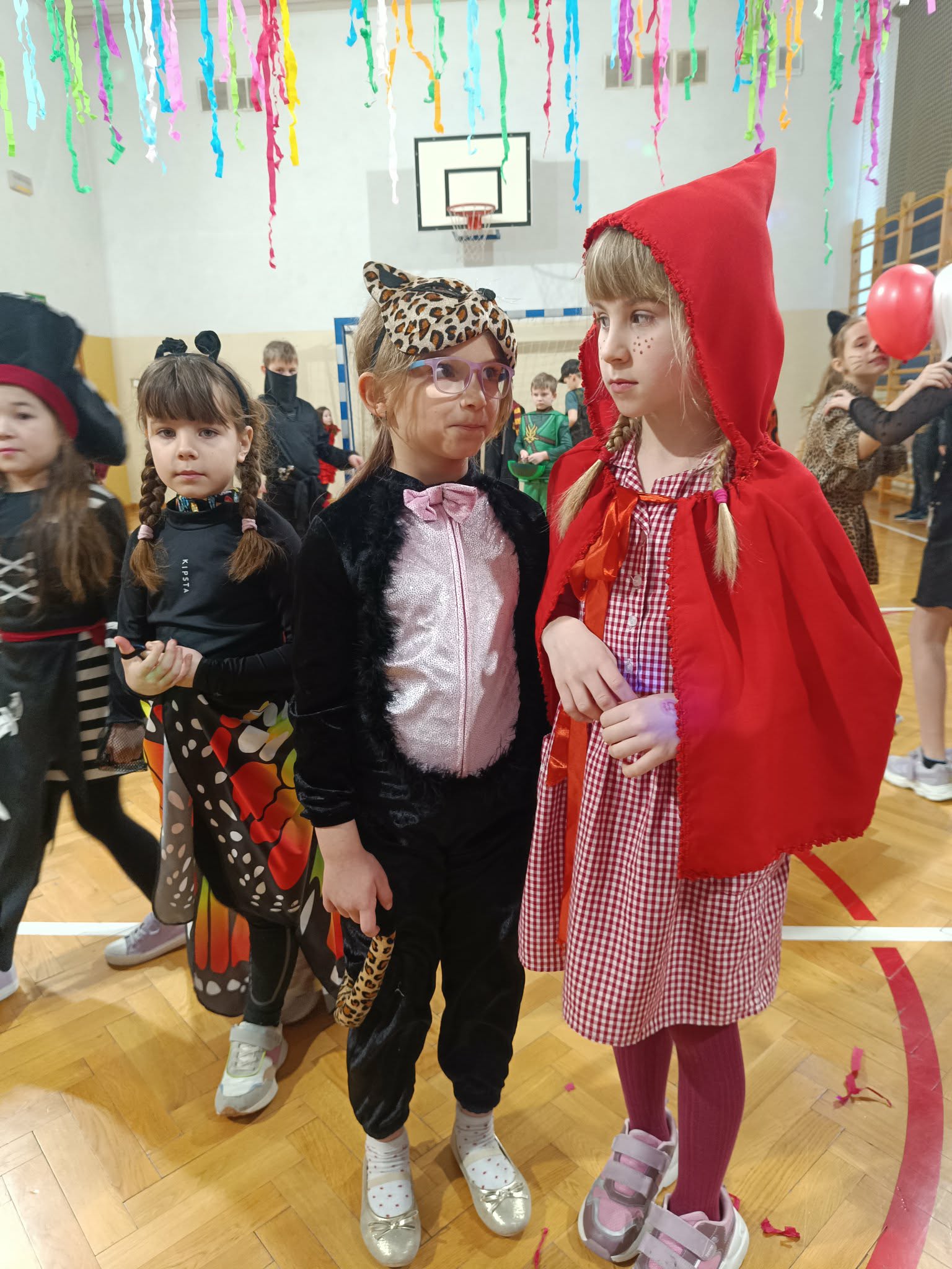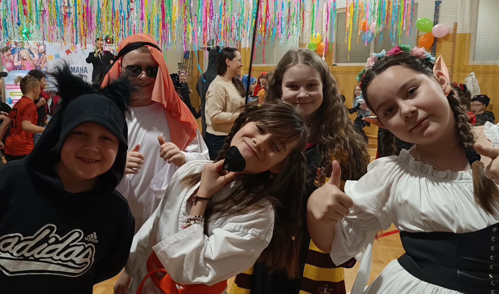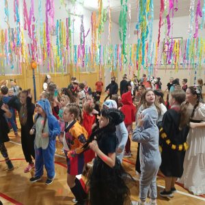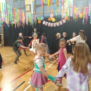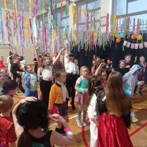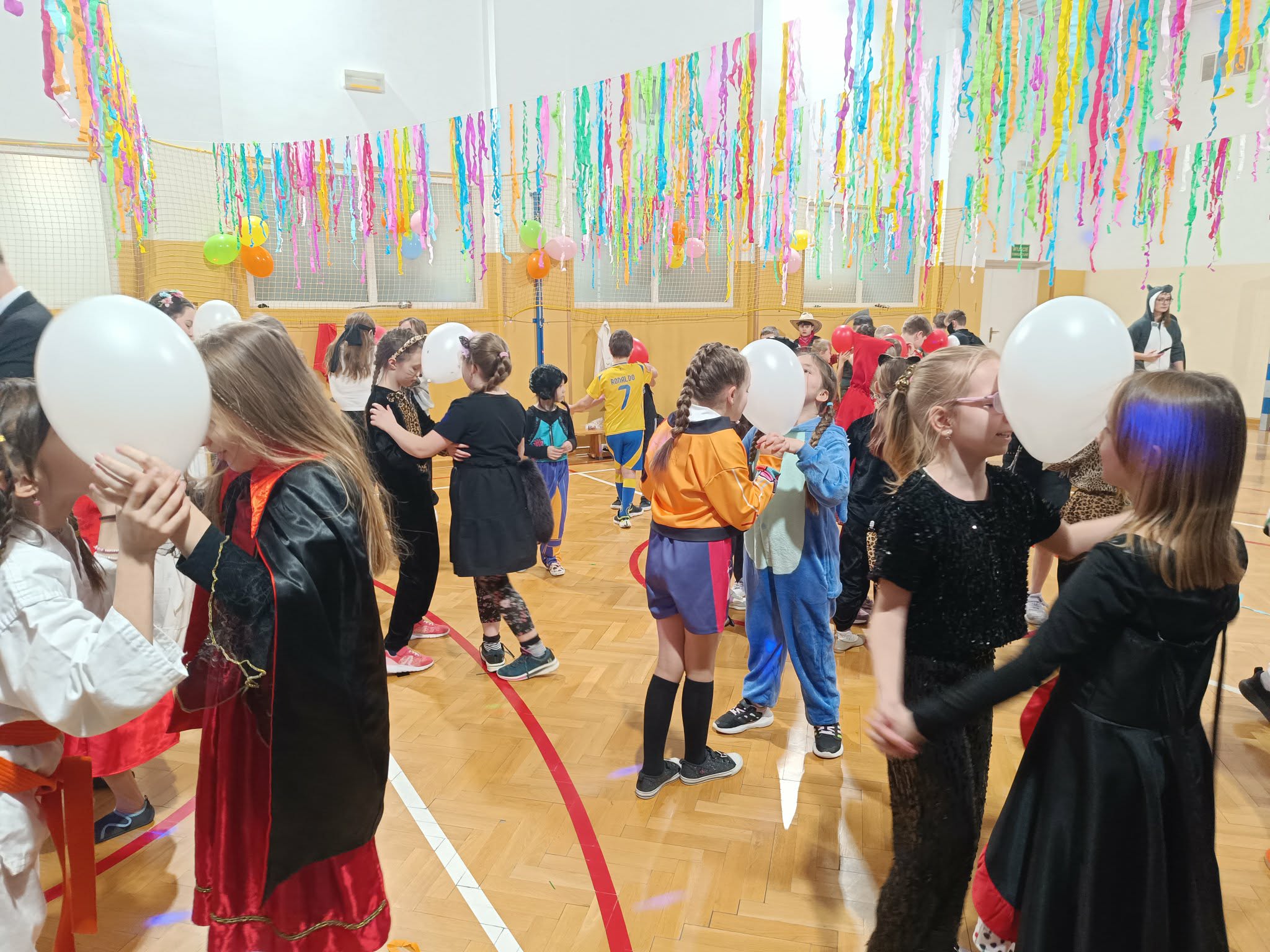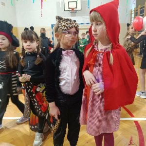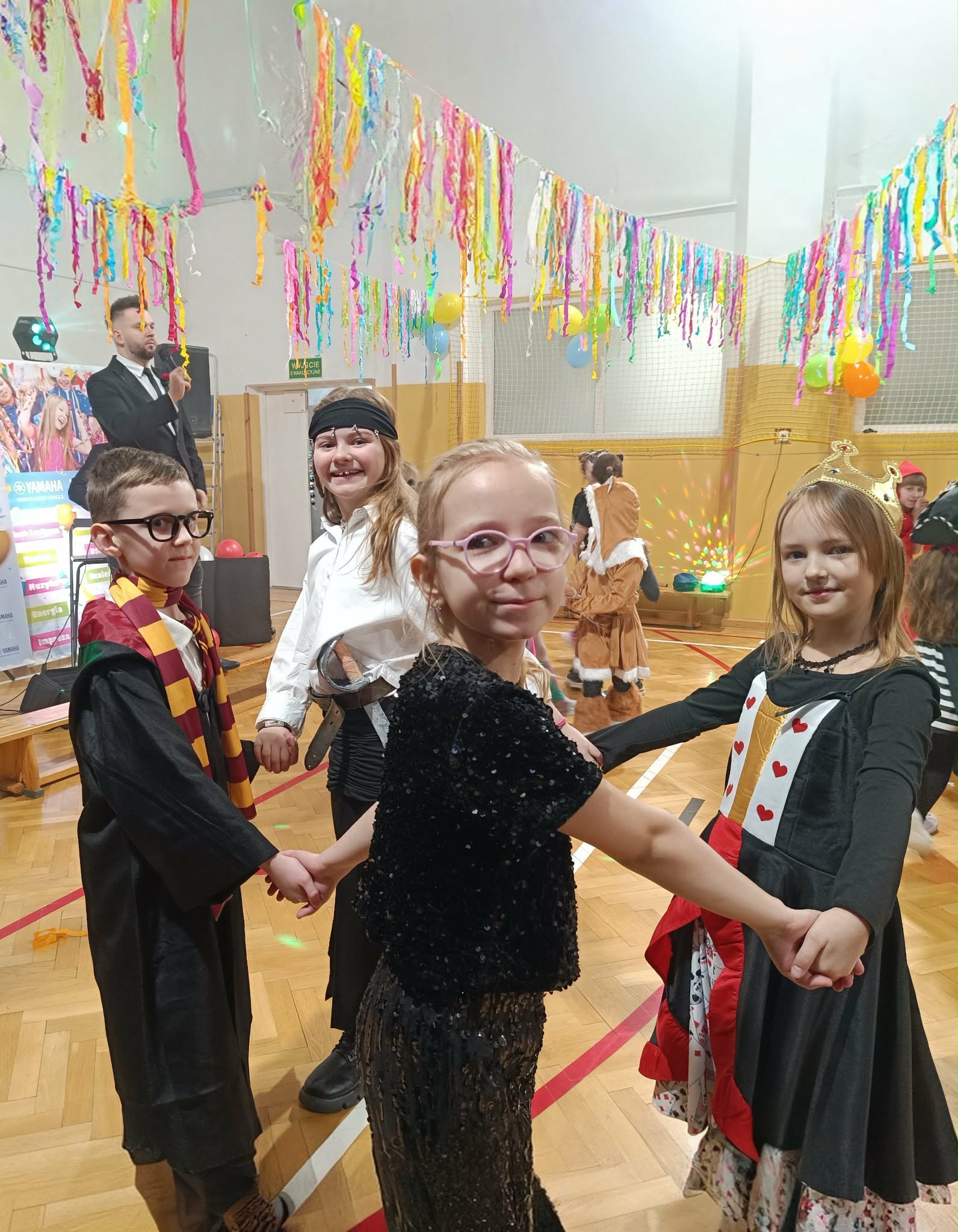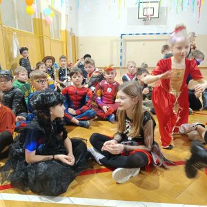 We wtorek, 13 stycznia w naszej szkole odbył się długo oczekiwany bal karnawałowy. Przystrojona sala gimnastyczna zamieniła się w prawdziwą salę balowa, a uczniowie wcielili się w nowe role. Na parkiecie pojawili się bohaterowie znanych bajek i filmów tj. Czerwony Kapturek, Harry Poter, Hermiona, Wednesday, księżniczki, piraci, wróżki, ale również stróże prawa, superbohaterowie i słodkie zwierzaki.  Karnawałowe kreacje zaskakiwały, budził podziw, a nawet przerażenie. Jak przystało na prawdziwy bal, nie zabrakło pląsów i zabaw tanecznych. Były pociągi, korowody, kółeczka i tańce w parach. Dzieci chętnie brały  udział w  konkursach, a zwycięzcy nagradzani byli gromkimi brawami. Ten radosny dzień wszyscy zachowają w pamięci, co najmniej do przyszłego karnawału.