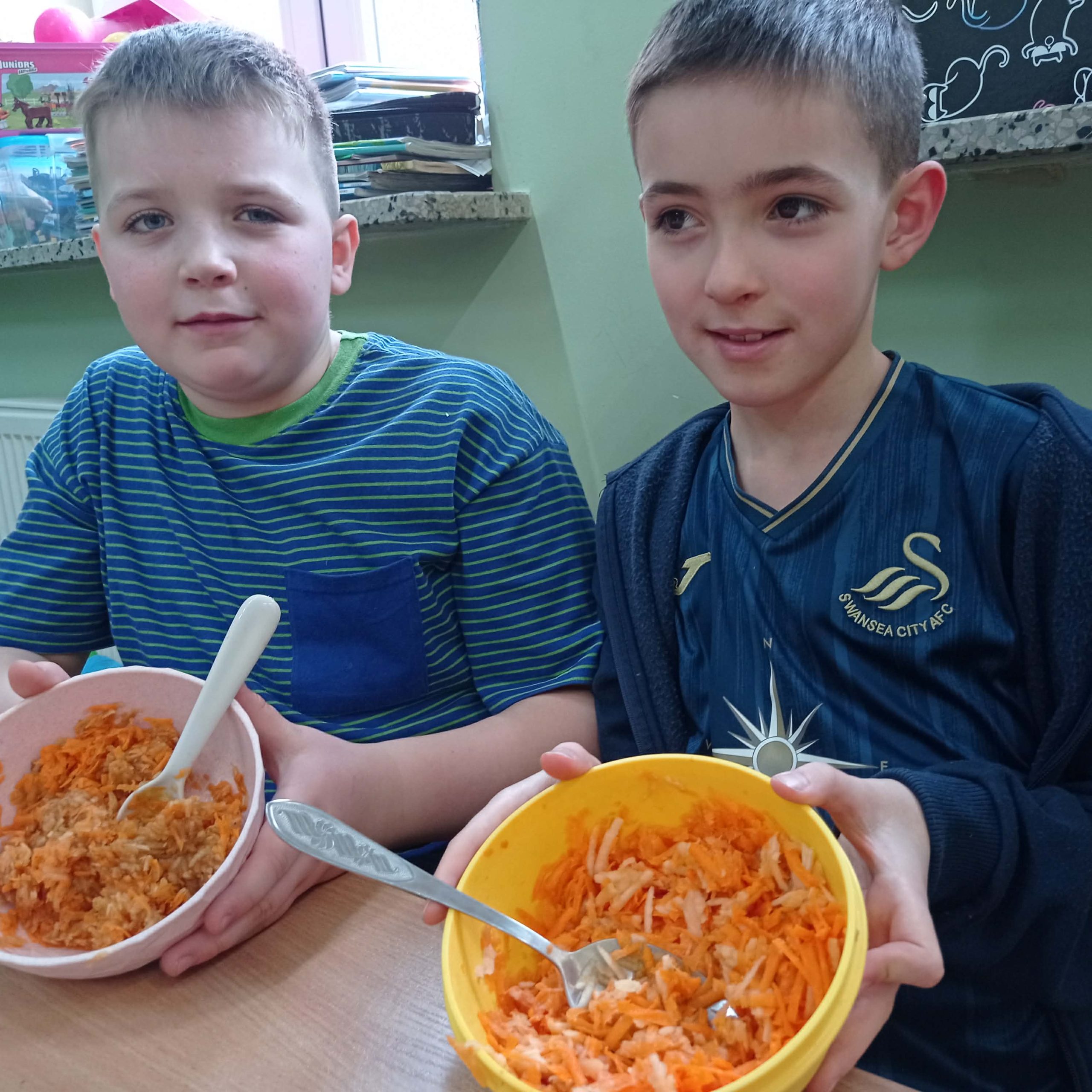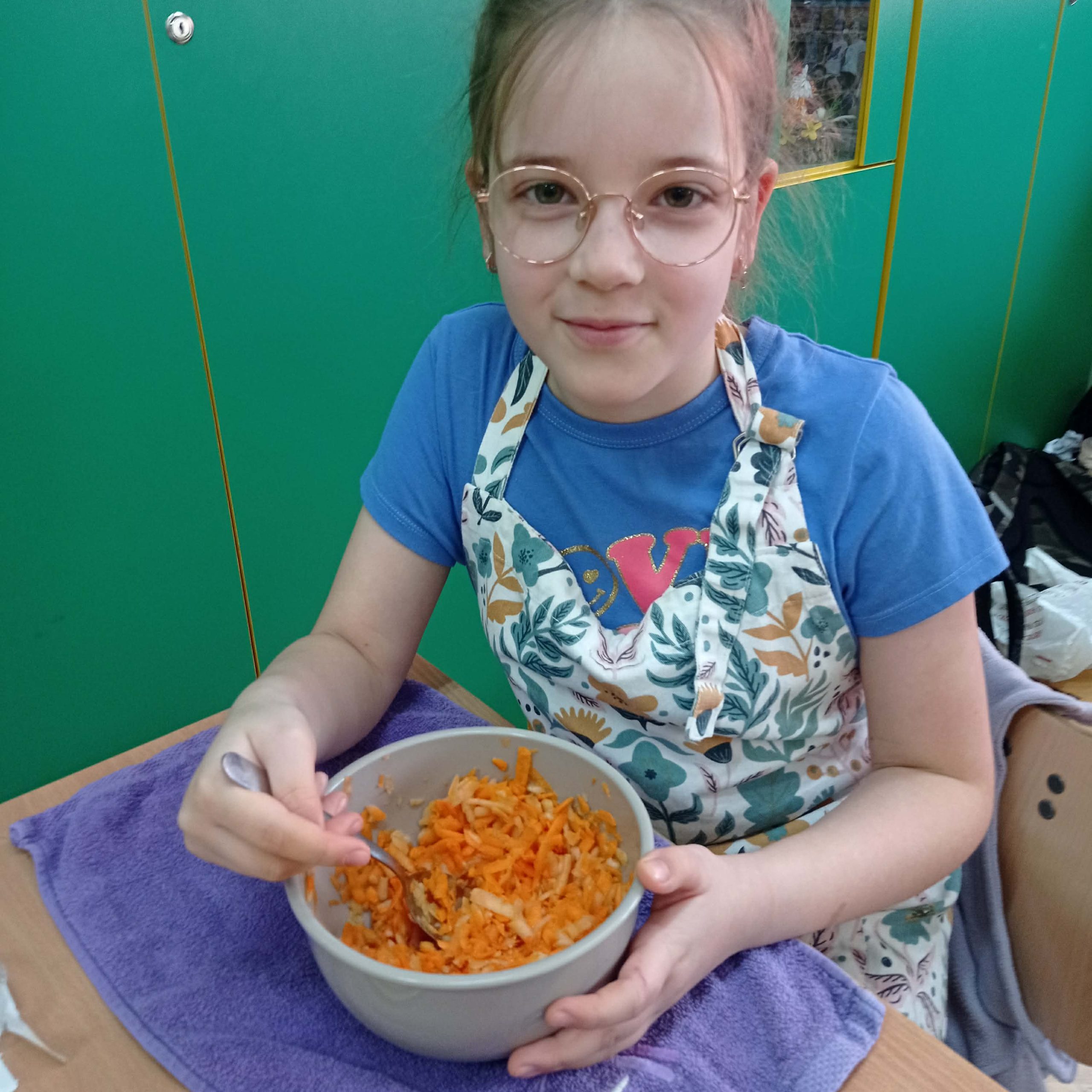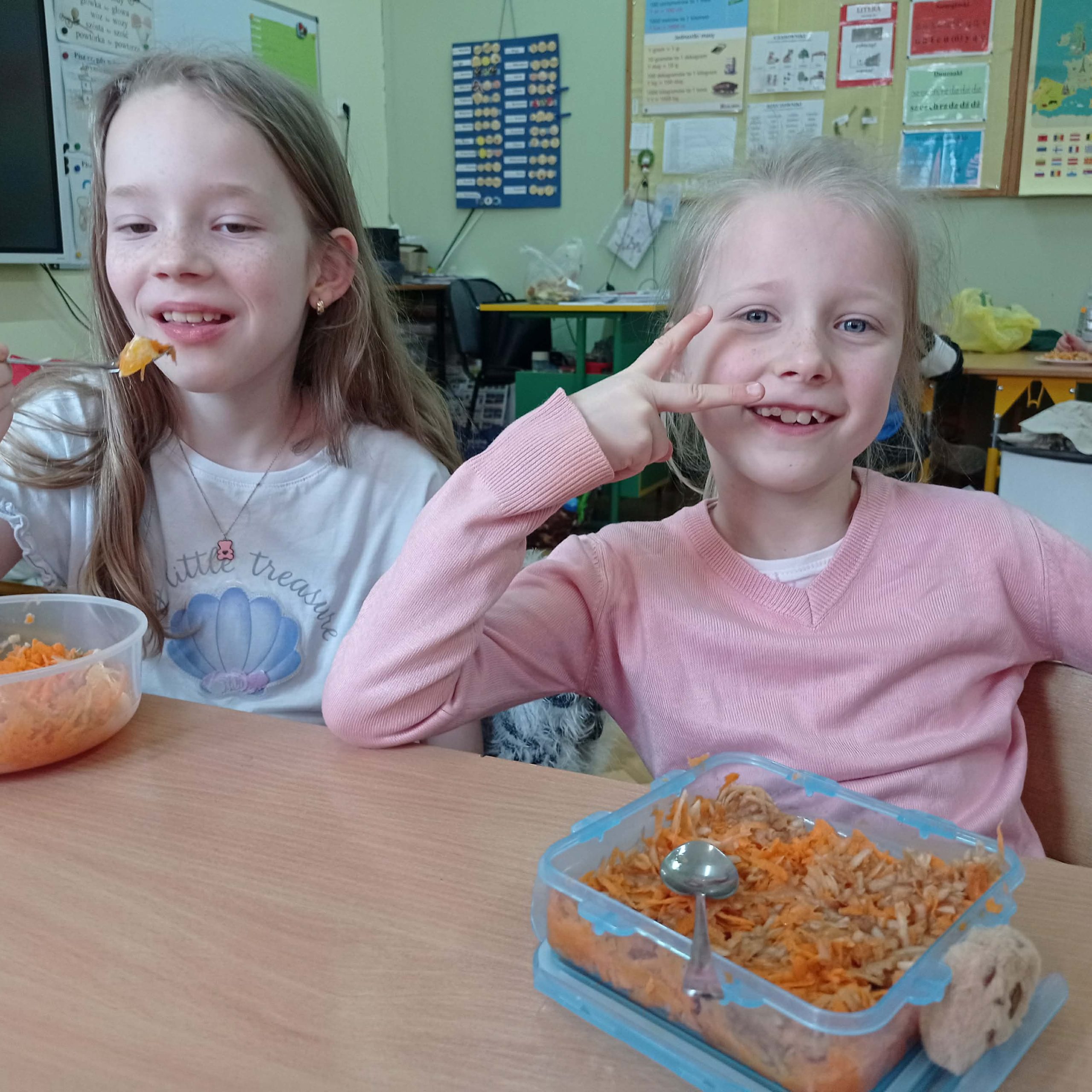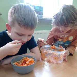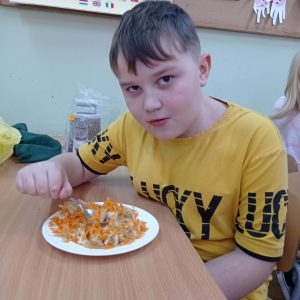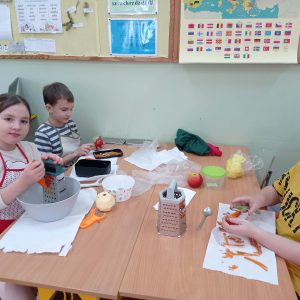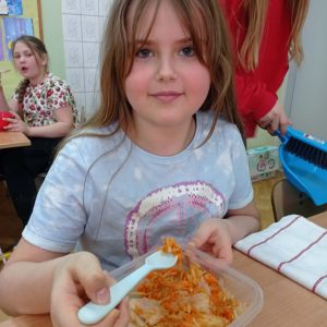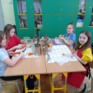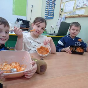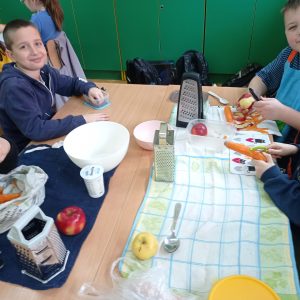 “Pysznie, zdrowo, witaminowo”- pod takim hasłem uczniowie klasy II pracowali podczas klasowych warsztatów kulinarnych.  Zajęcia były podsumowaniem bloku tematycznego związanego z dbaniem o swoje zdrowie, a co za tym idzie zdrowym odżywianiem.  Dzieci uczyły się że owoce i  warzywa są pełne dobrych składników odżywczych oraz witamin, dlatego postanowiły wykonać pyszne i zdrowe surówki.
