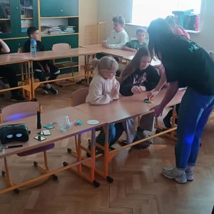 W drugiej części zajęć uczniowie przeszli do pracy przy stolikach i samodzielnie wykonały kalejdoskop, który następnie zabrały ze sobą do domu jako pamiątkę po warsztacie.