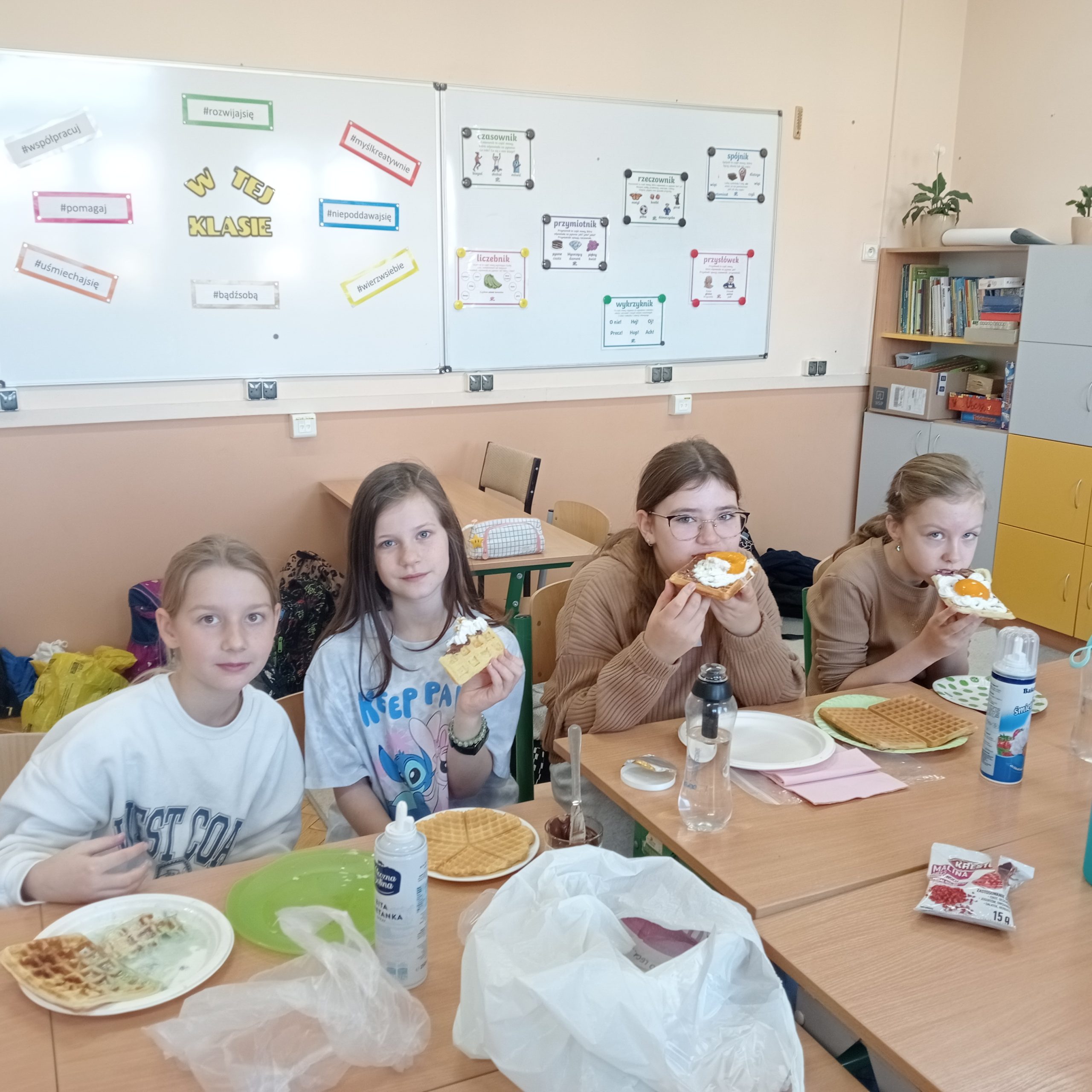 Efektem takiej lekcji są nie tylko smaczne przekąski, po których już dawno nie ma śladu. Wartość dodana tego mile spędzonego czasu to umiejętność współpracy, dzielenia się, cierpliwego czekania na swoją kolej. To także współodpowiedzialność za porządek w miejscu pracy, co jak się okazało, wszyscy doskonale rozumieją. Bowiem tak samo szybko, jak znikały gofry, tak samo sprawnie czwartoklasiści uporali się z brudnymi talerzami, zużytymi serwetkami, czy zachlapanymi ciastem ławkami.