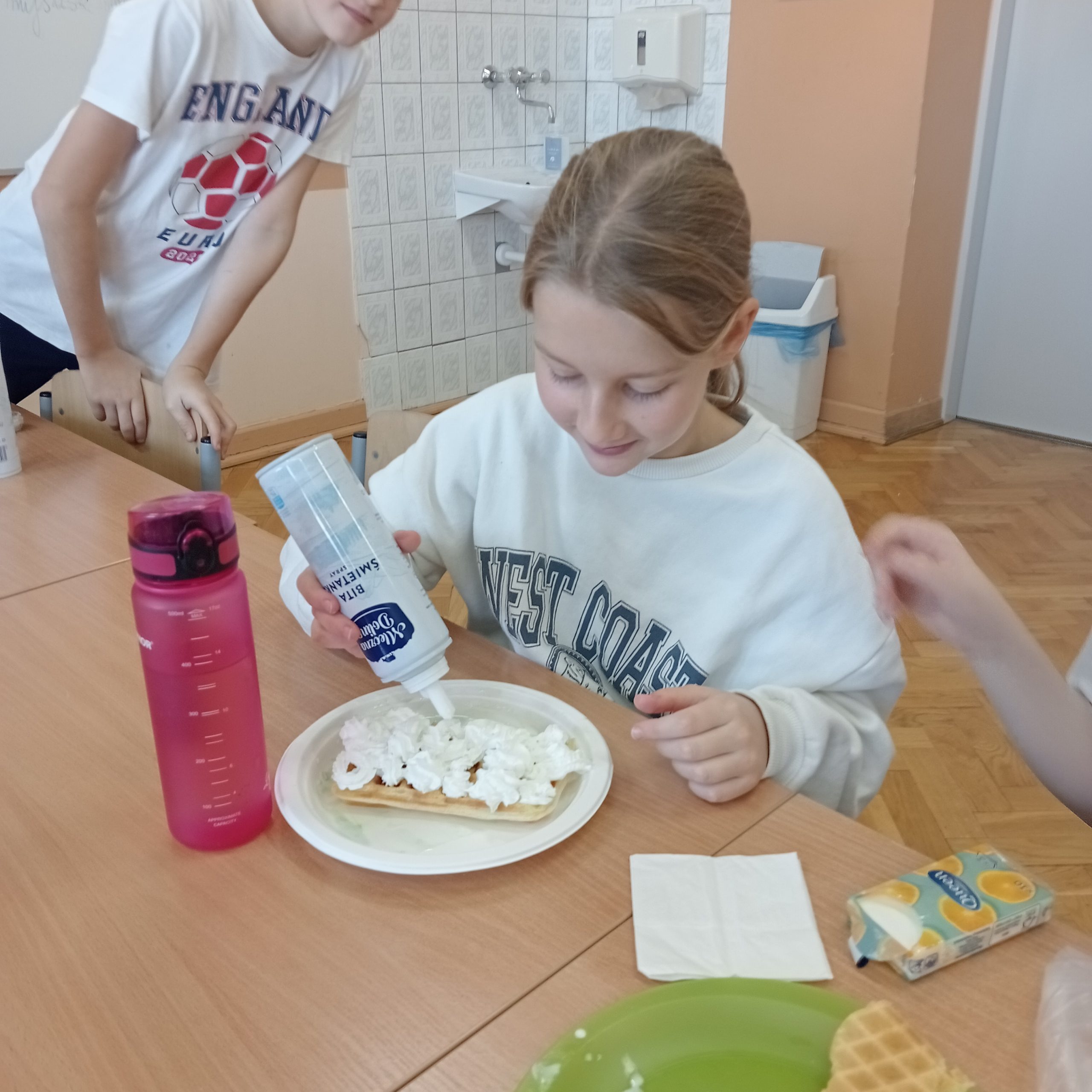 W miniony piątek, z inicjatywy samorządu klasowego, uczniowie samodzielnie przygotowali pyszne drugie śniadanie. Zaopatrzeni w potrzebne produkty oraz w gofrownice z zapałem przystąpili najpierw do pieczenia, a następnie dekorowania ulubionymi dodatkami chrupiących gofrów. Wykonywanie tych czynności przyniosło dzieciom dużo radości oraz satysfakcji. Pracy towarzyszył śmiech i wesołe rozmowy, ale przede wszystkim skupienie i przestrzeganie zasad bezpieczeństwa podczas korzystania z rozgrzanych gofrownic.